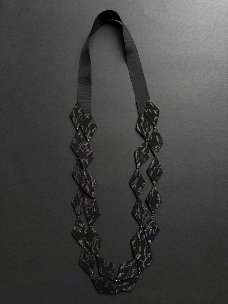 A necklace featuring diamond-shaped beads encased in silk from a sumptuous antique kimono.