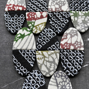 Wooden beads sheathed in beautiful gold and silver silk brocade fabric from an antique kimono. The beads are mounted on a cord. The necklace fastens with a button.